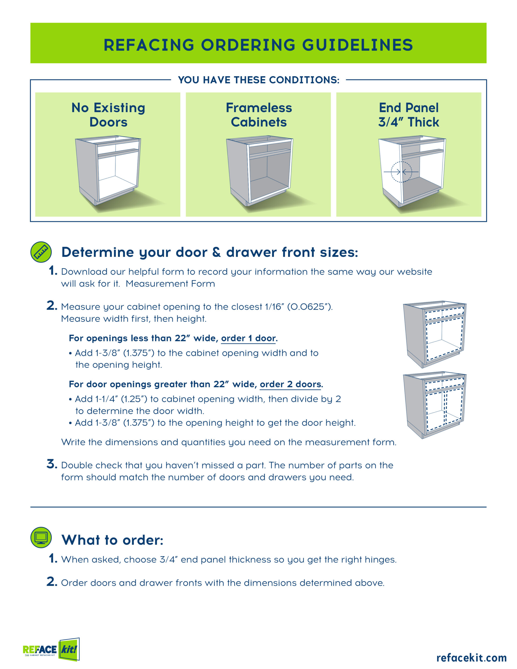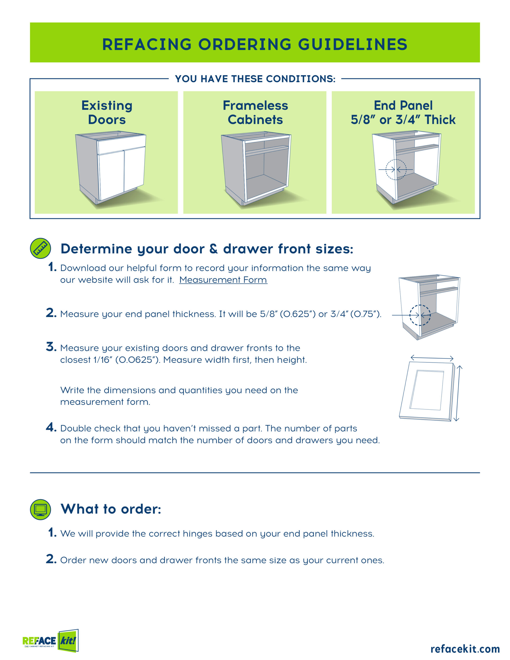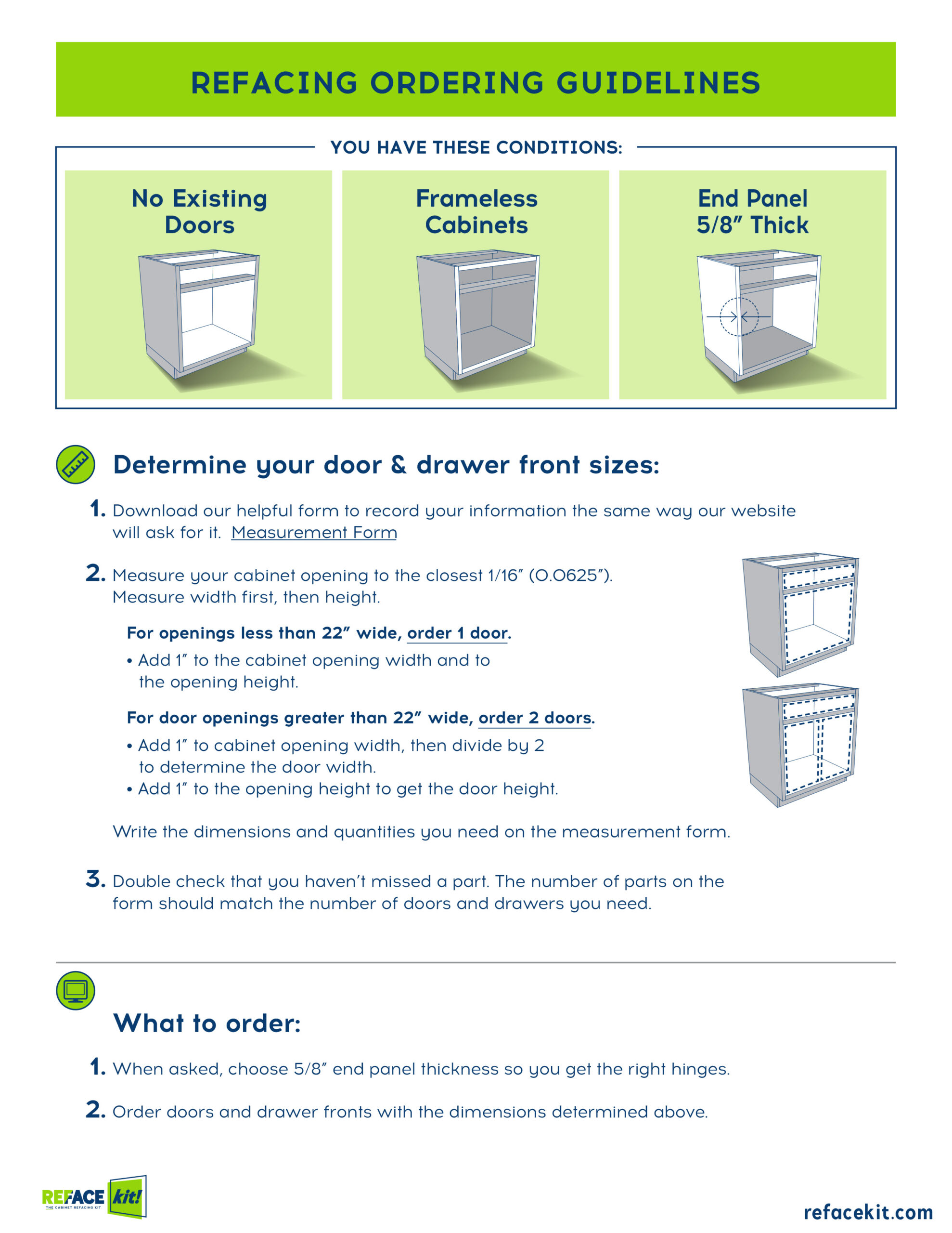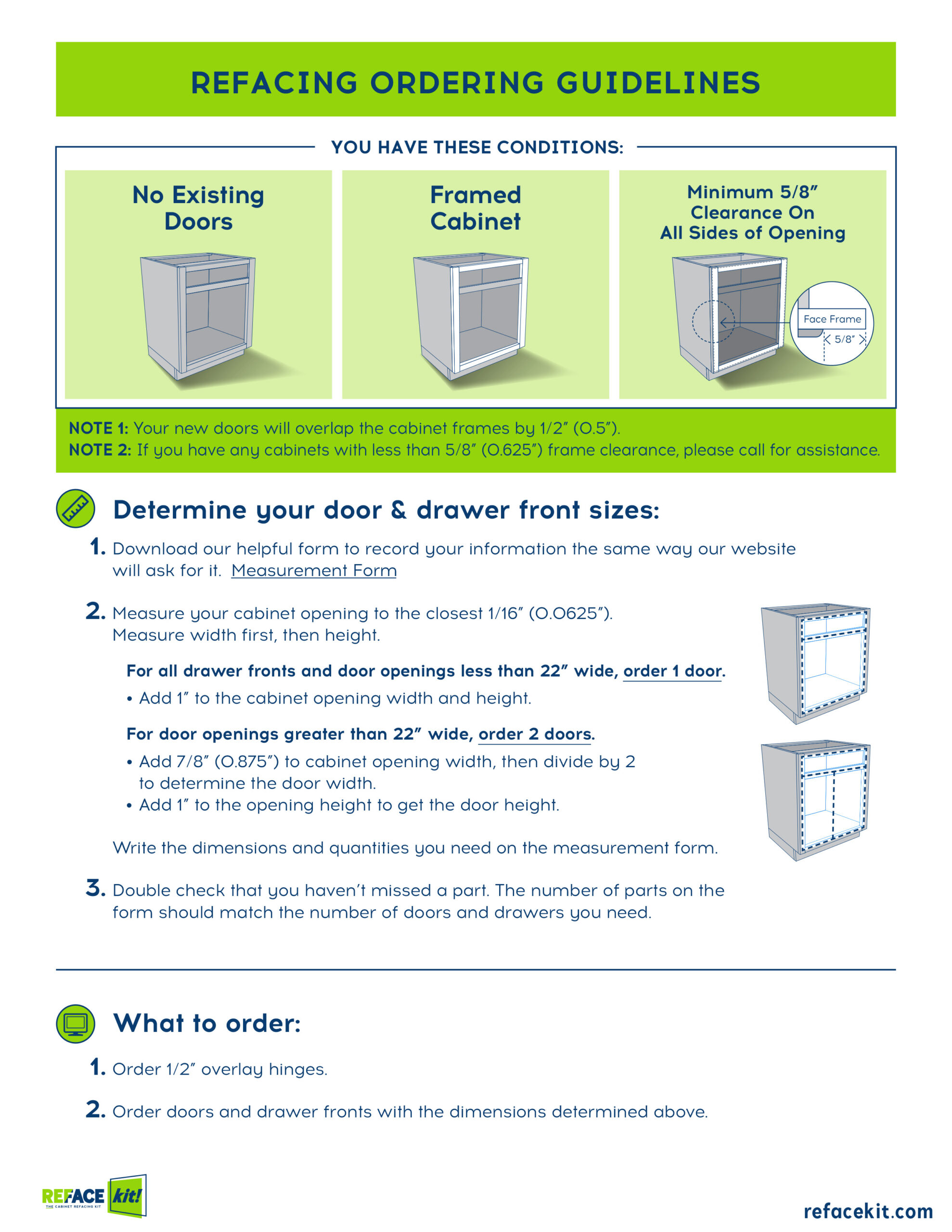We’ve provided a collection of guidelines to help you order doors for specific types of cabinets. Go to the Download Center below or use the RefaceKit guide tool to step through specific questions that let us provide guidelines tailored to your specific needs.