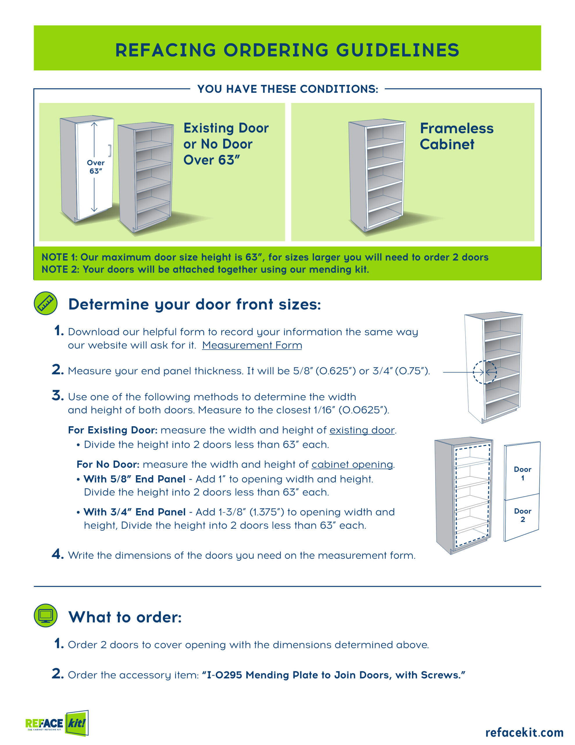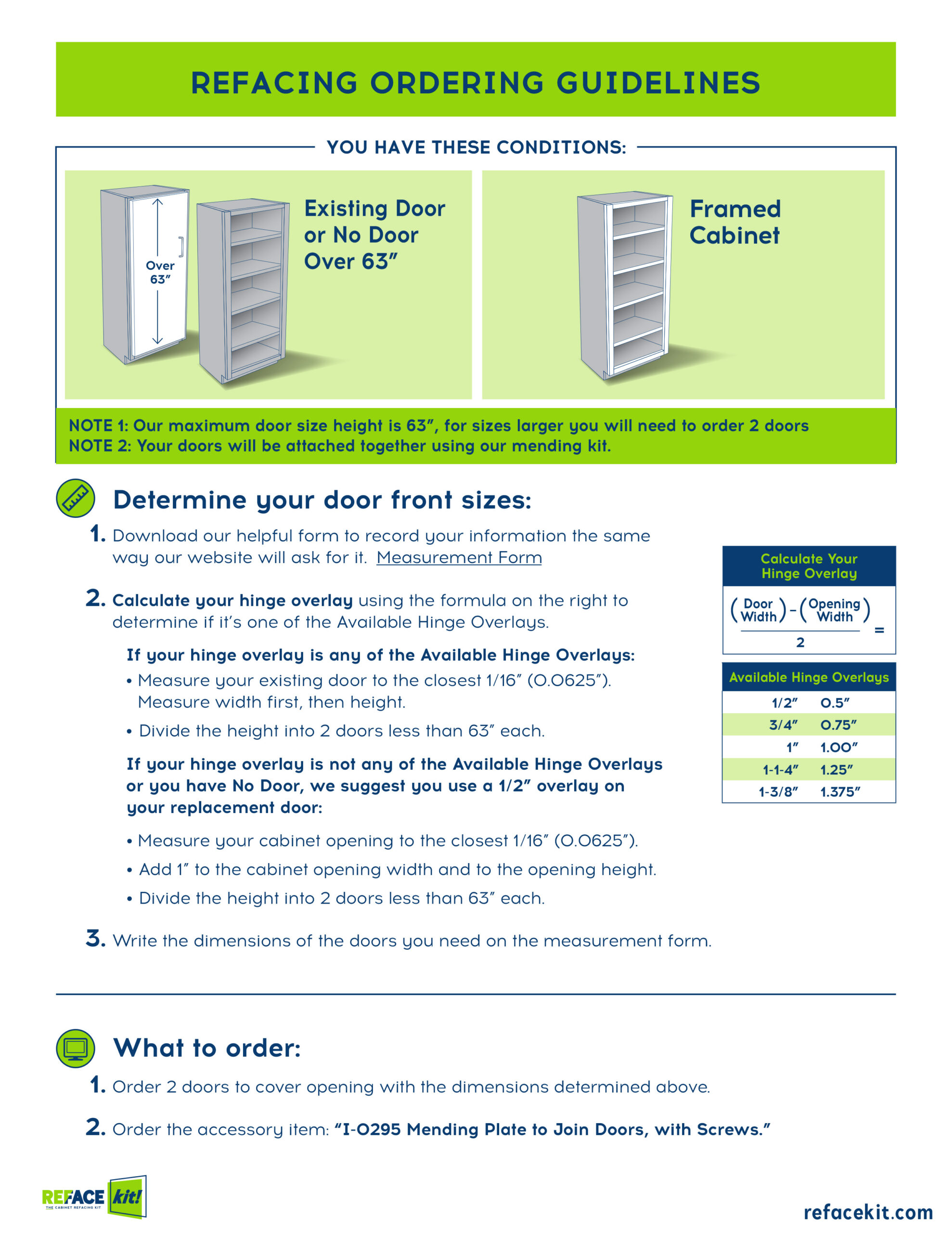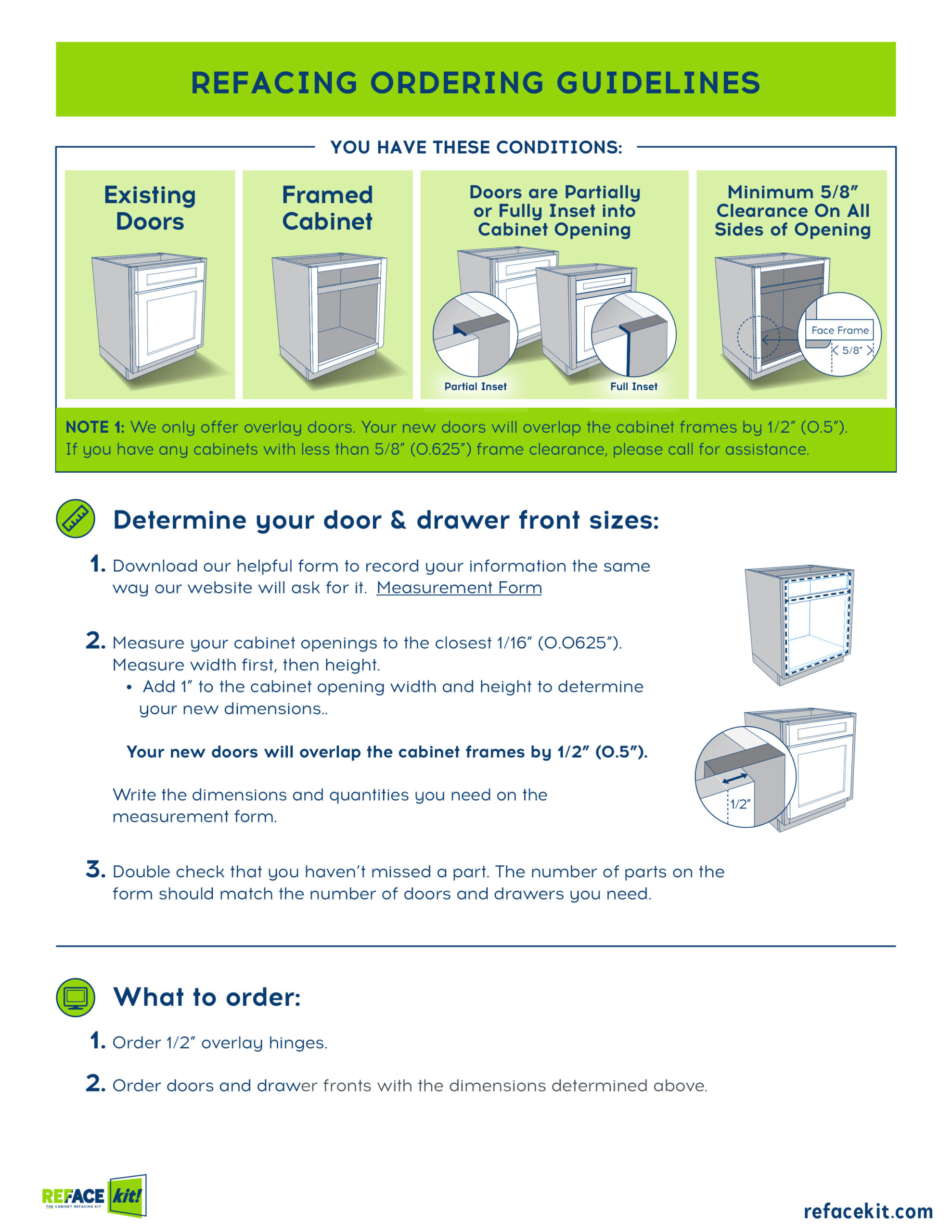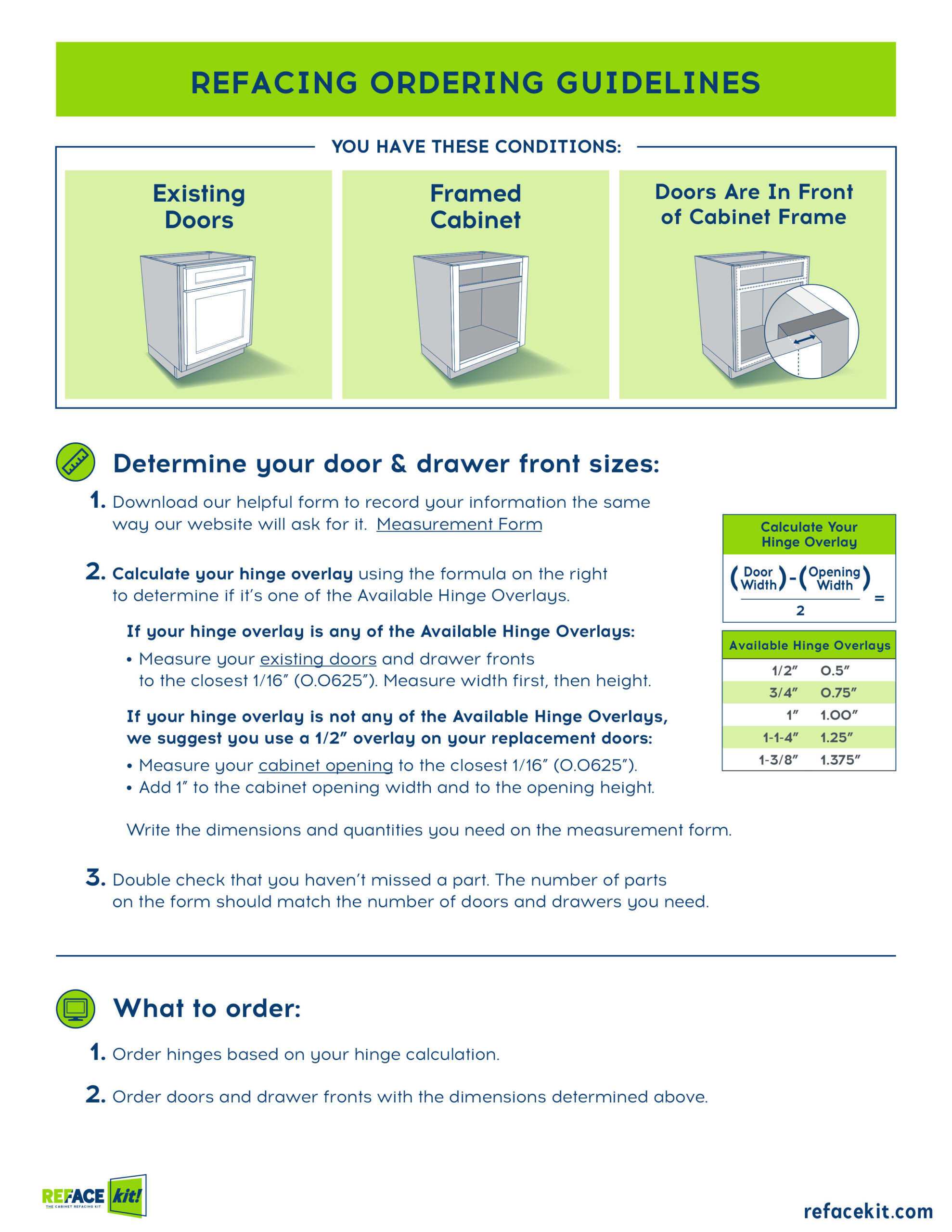 We’ve provided a collection of guidelines to help you order doors for specific types of cabinets. Go to the Download Center below or use the RefaceKit guide tool to step through specific questions that let us provide guidelines tailored to your specific needs.