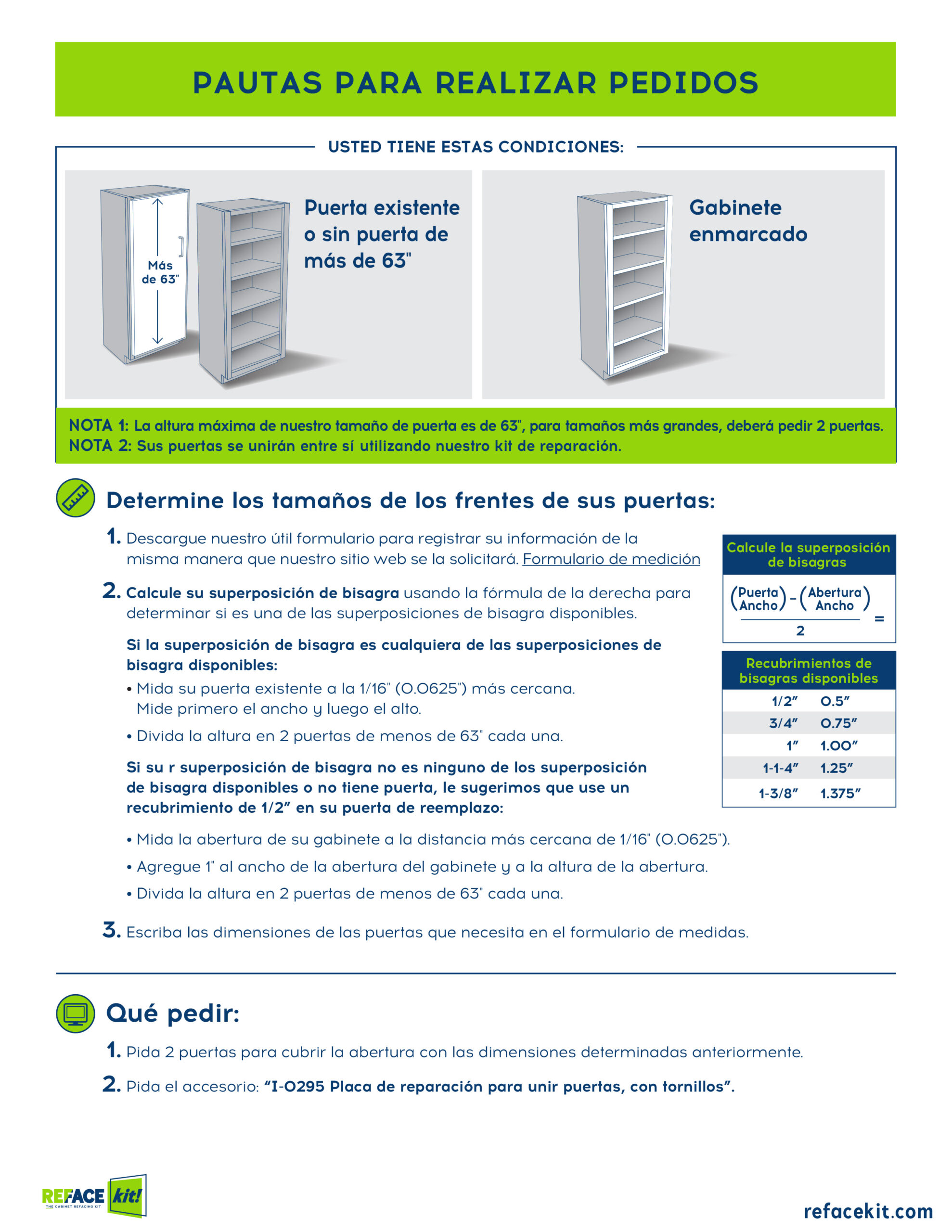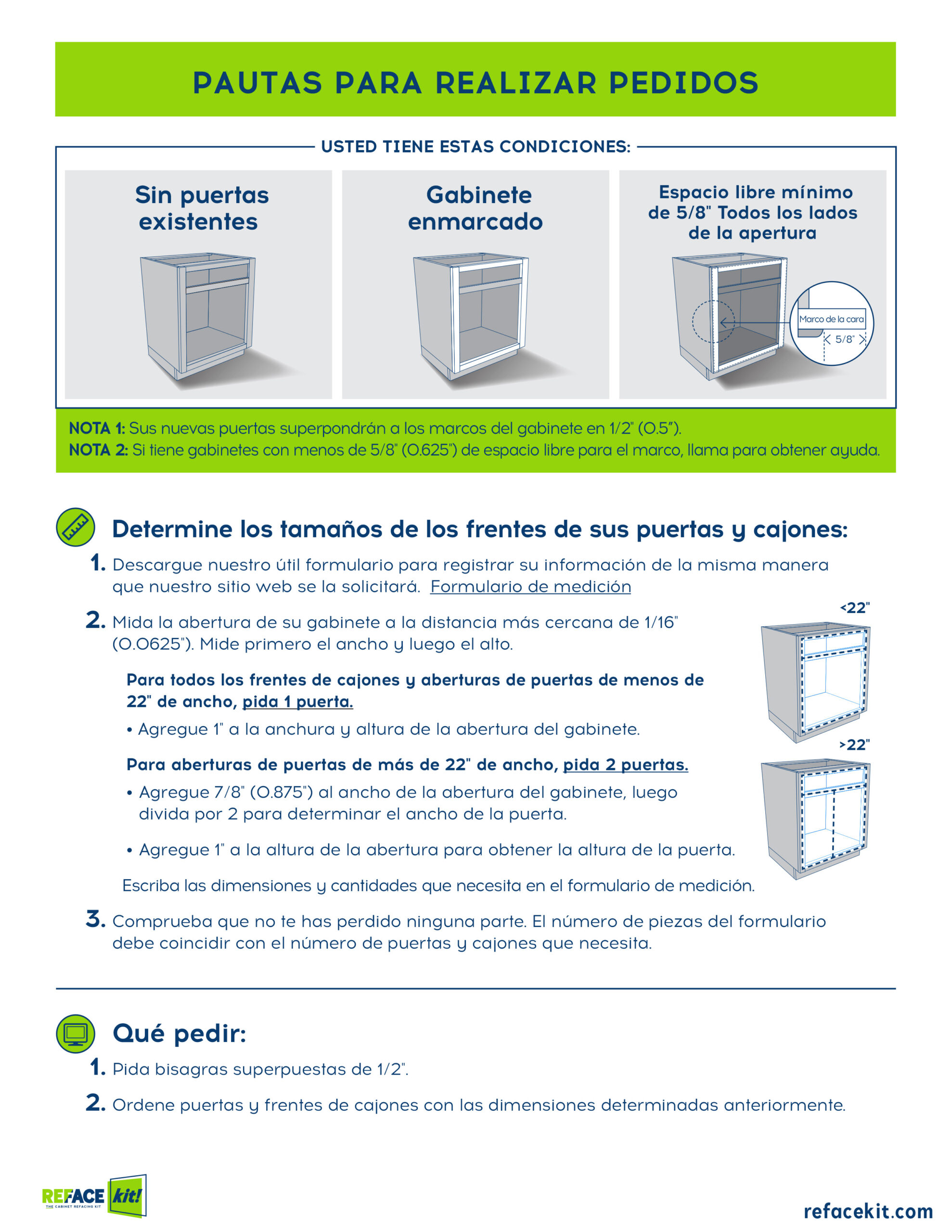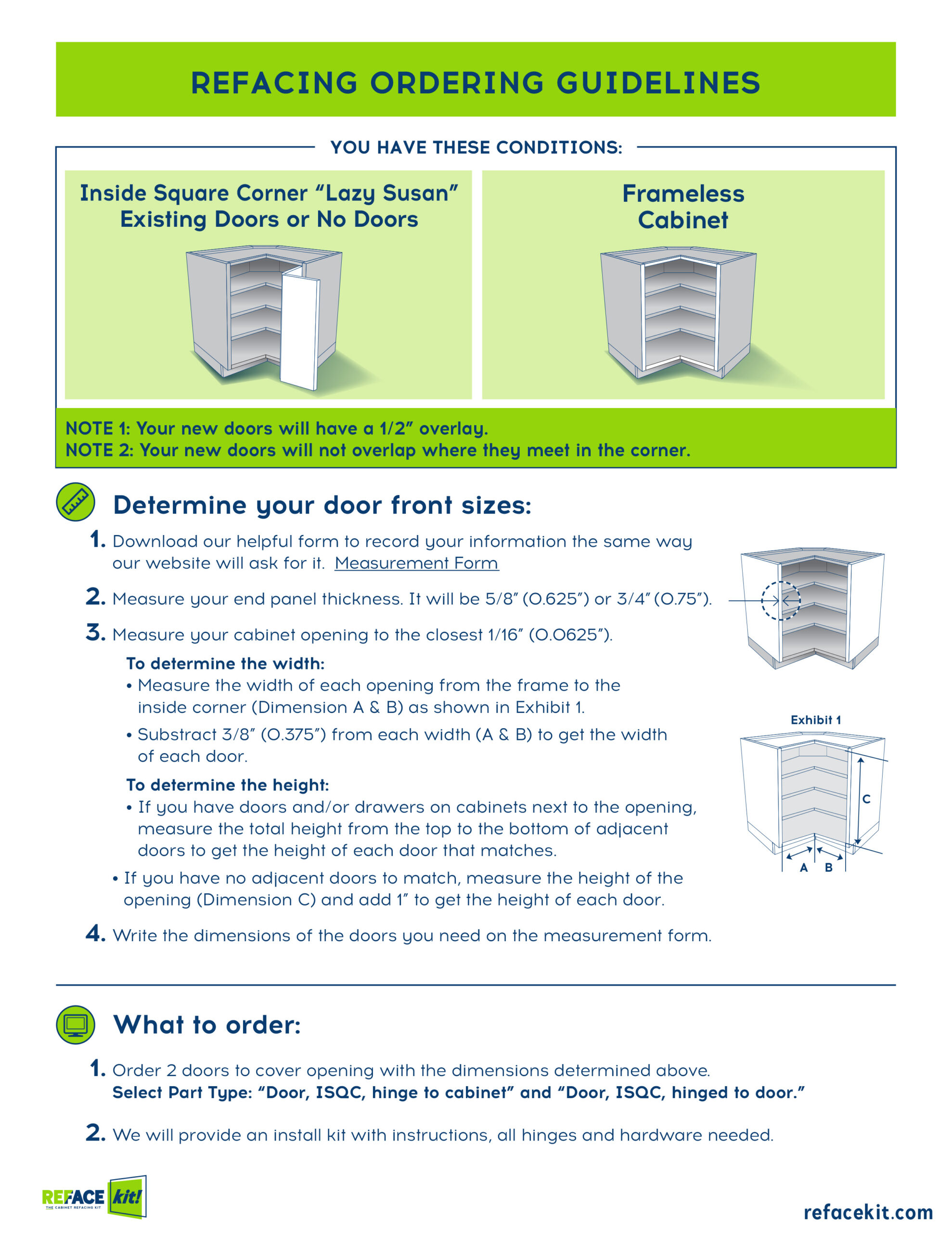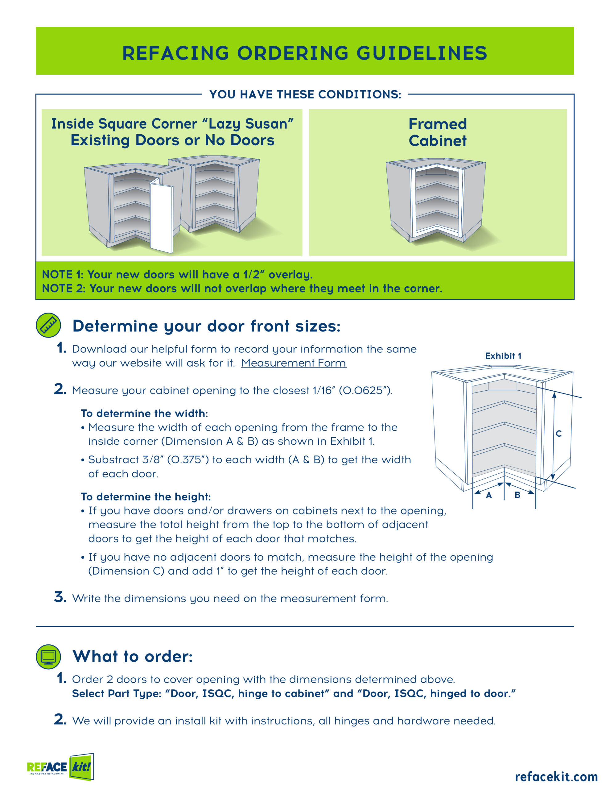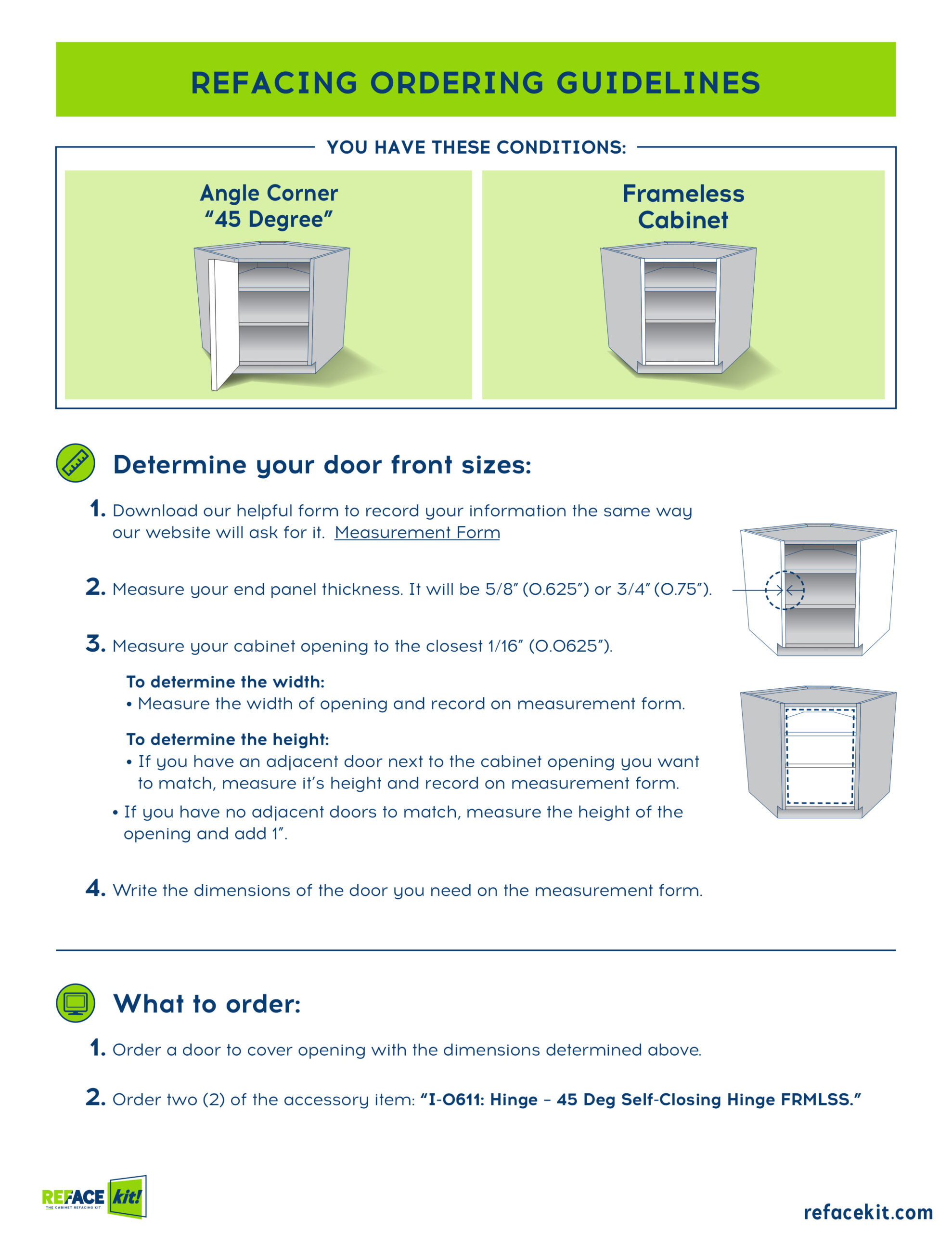 We’ve provided a collection of guidelines to help you order doors for specific types of cabinets. Go to the Download Center below or use the RefaceKit guide tool to step through specific questions that let us provide guidelines tailored to your specific needs.