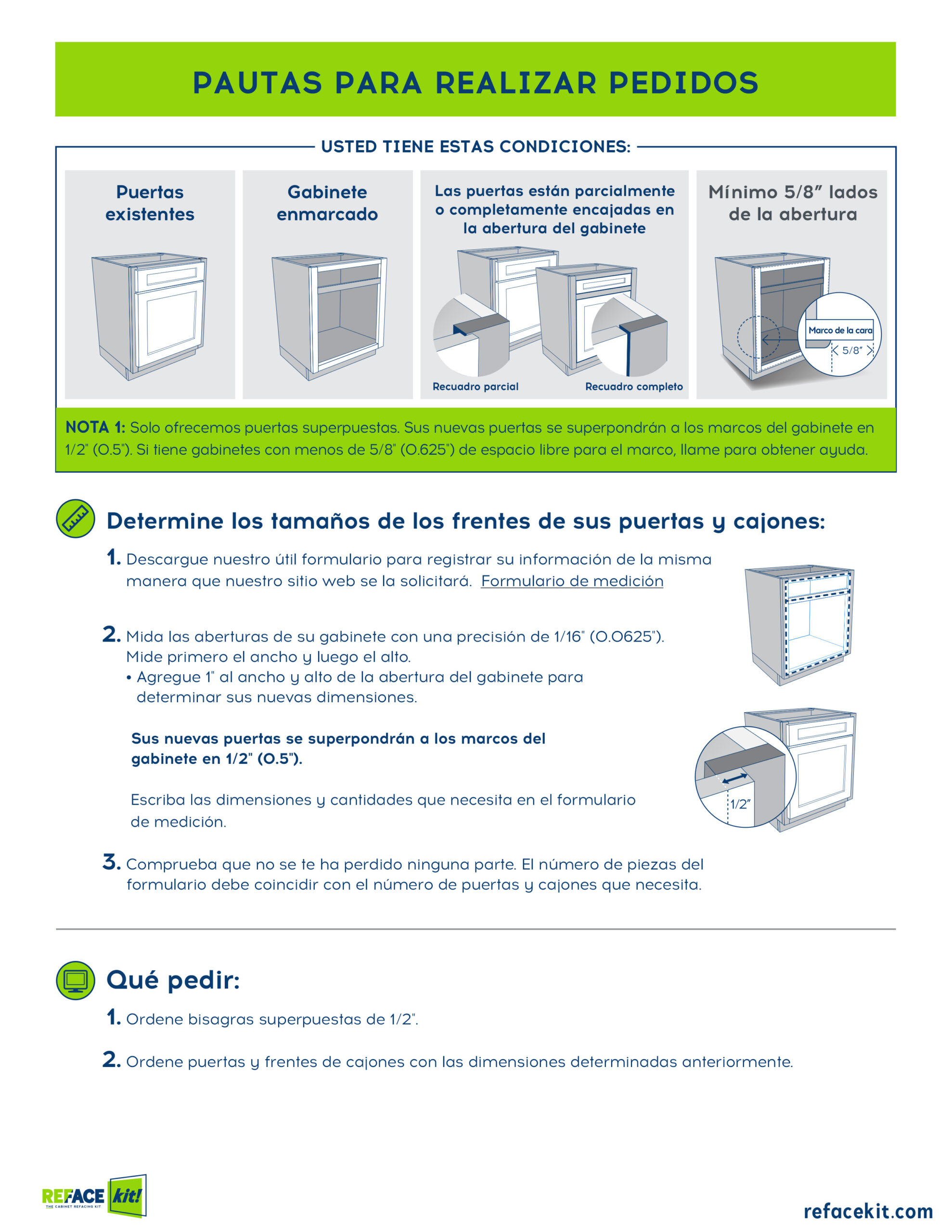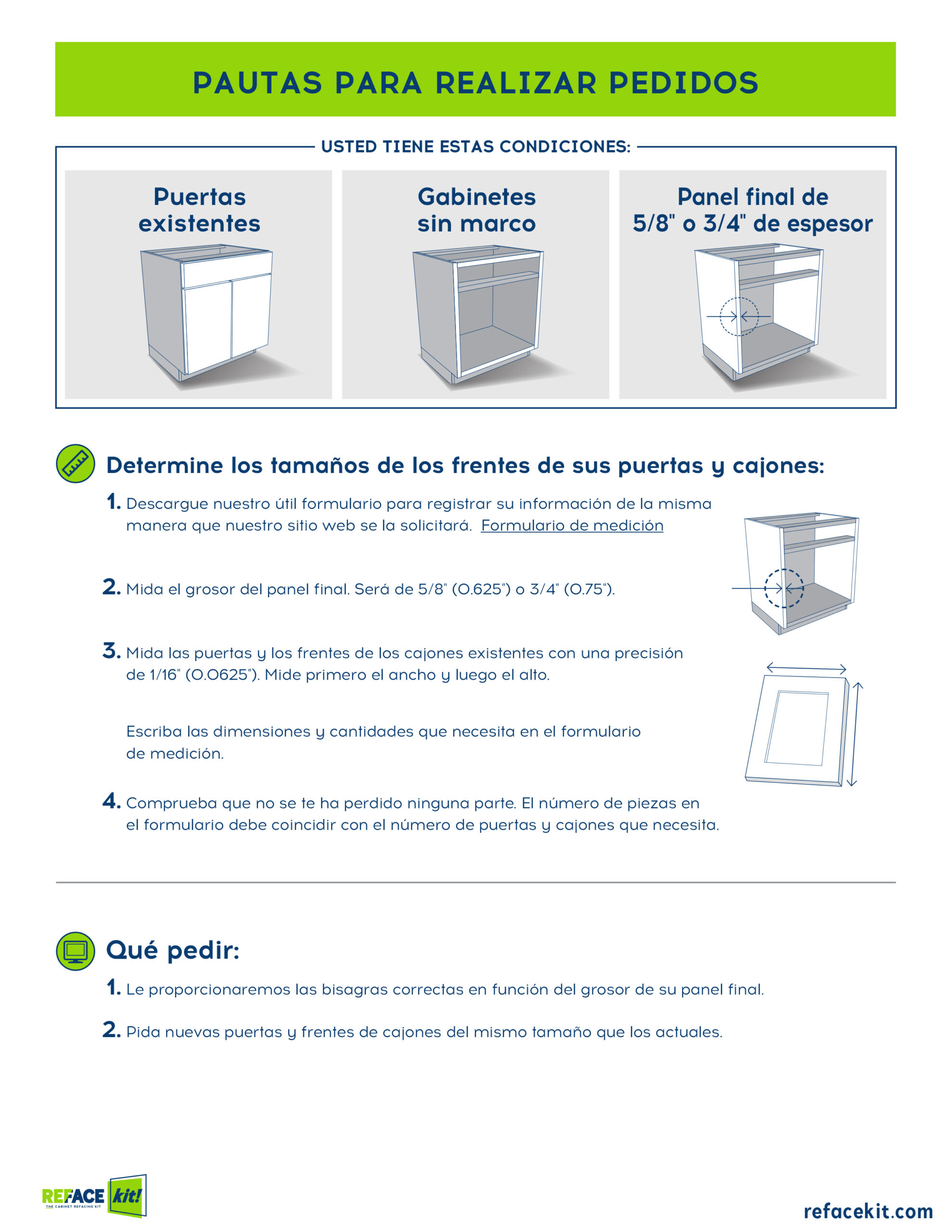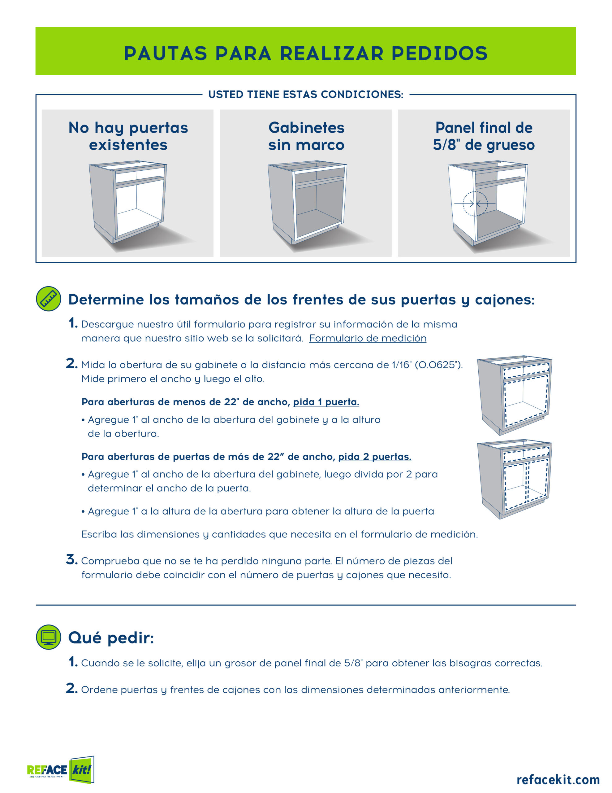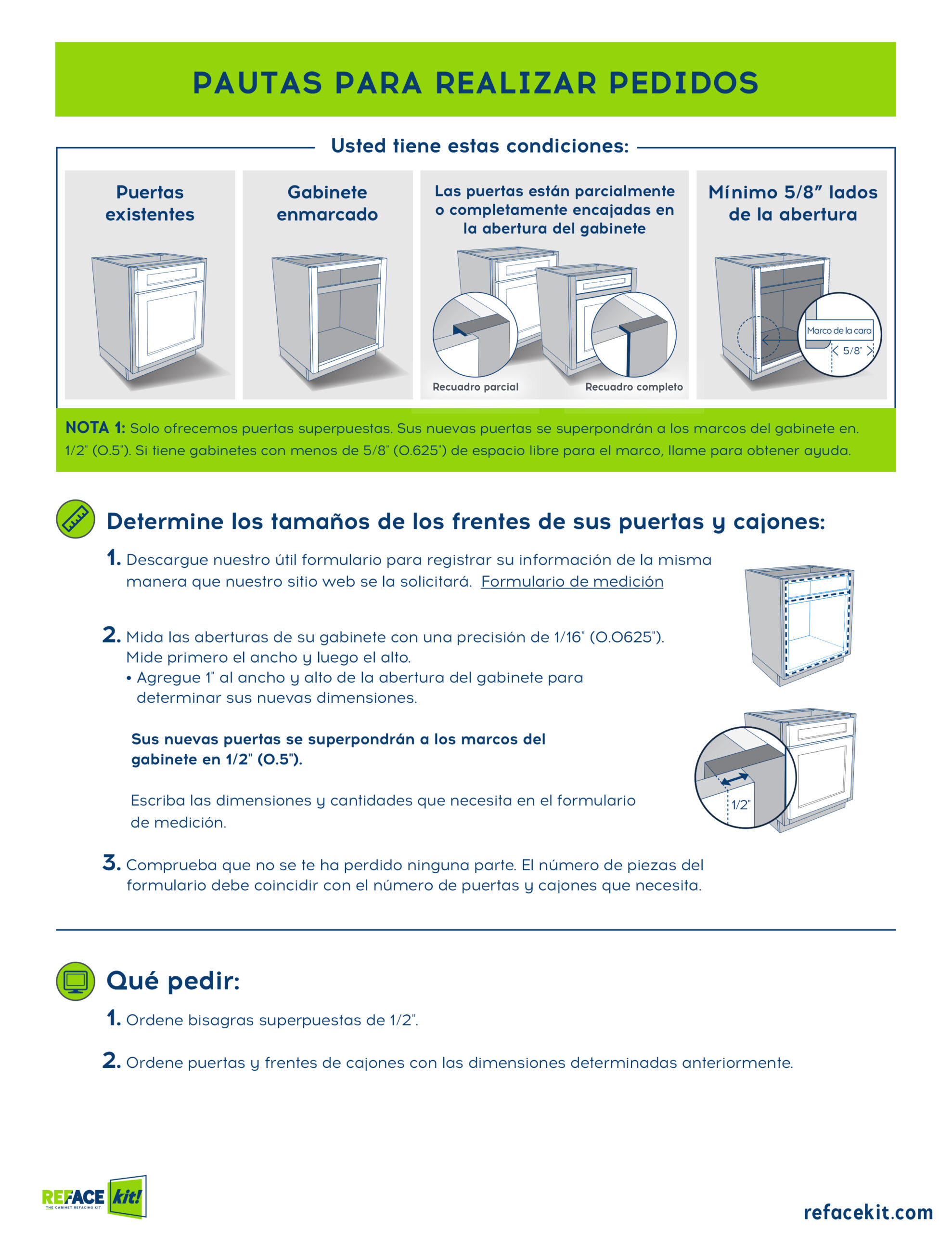 We’ve provided a collection of guidelines to help you order doors for specific types of cabinets. Go to the Download Center below or use the RefaceKit guide tool to step through specific questions that let us provide guidelines tailored to your specific needs.